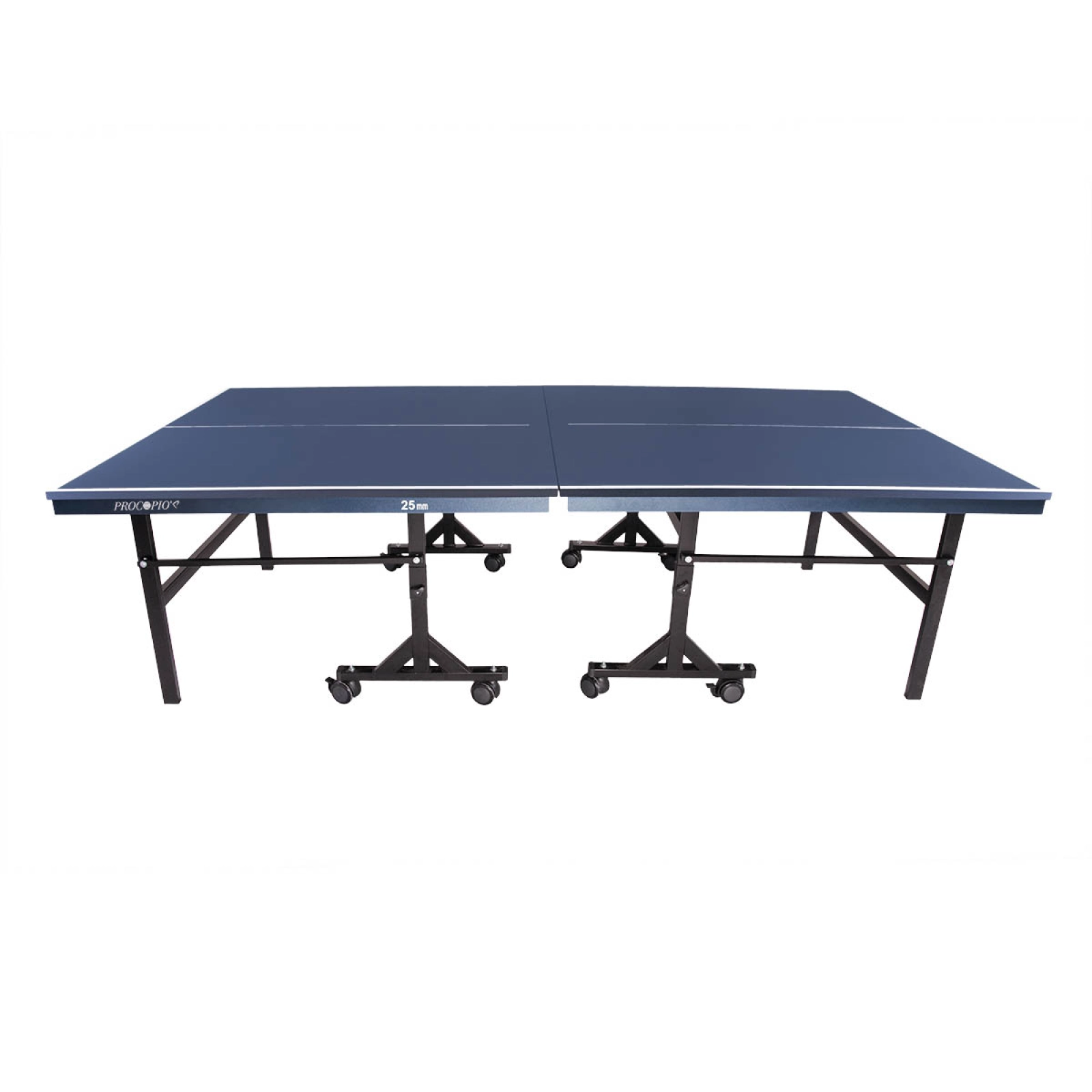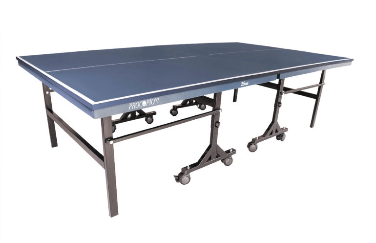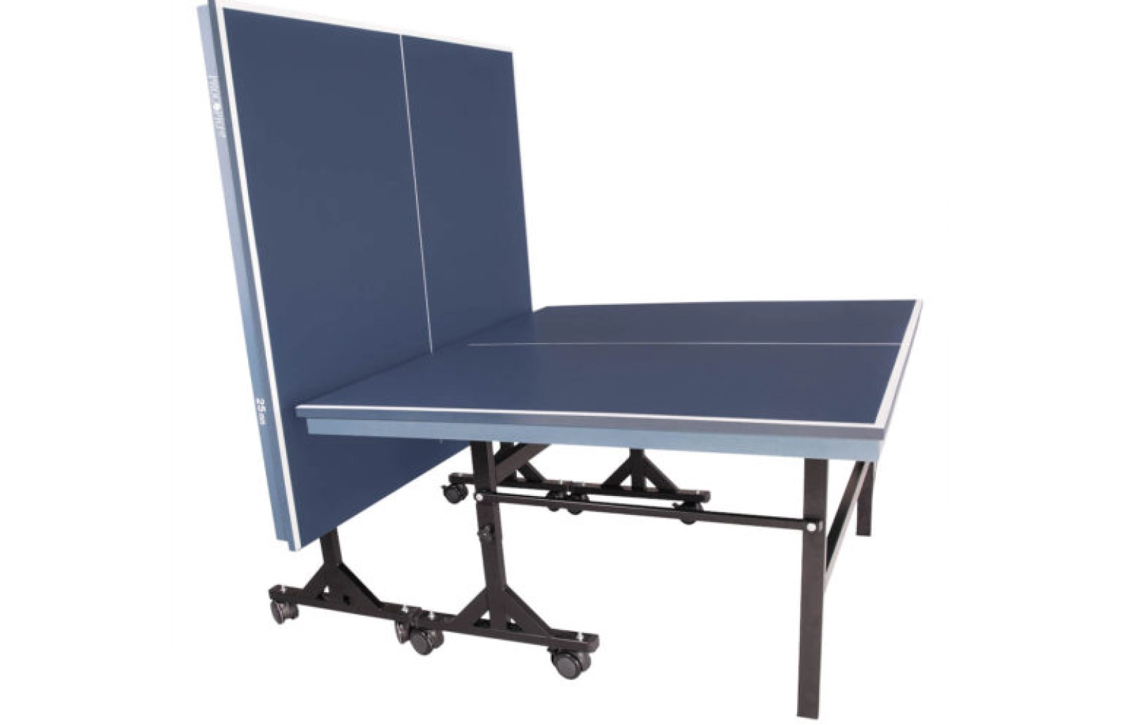 Acabamento em laca azul fosco com linhas demarcatória branca, estrutura dos pés articulados em ferro, pés com proteção e pintura eletrostática preta, com rodízio nos pés centrais.